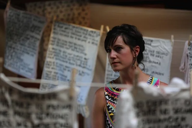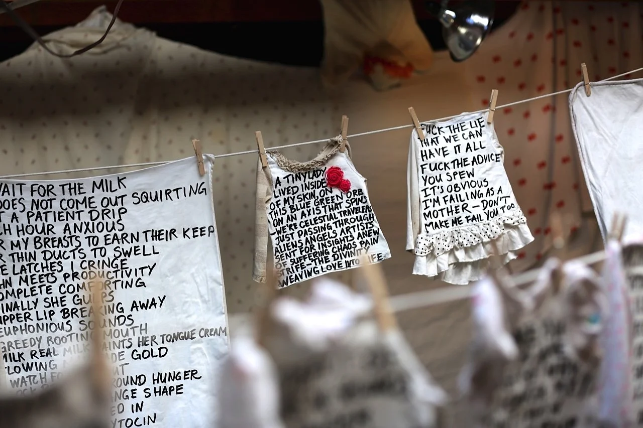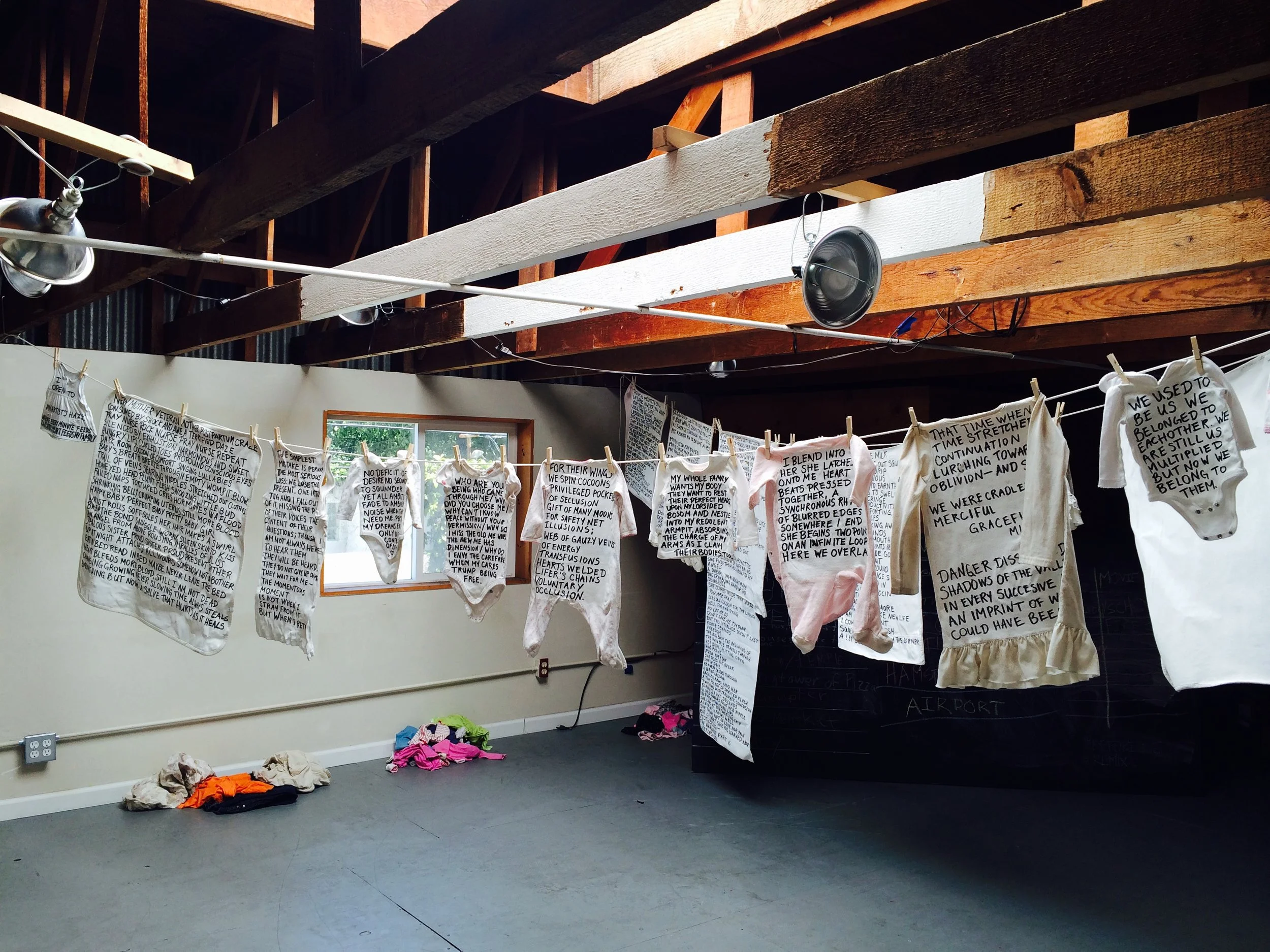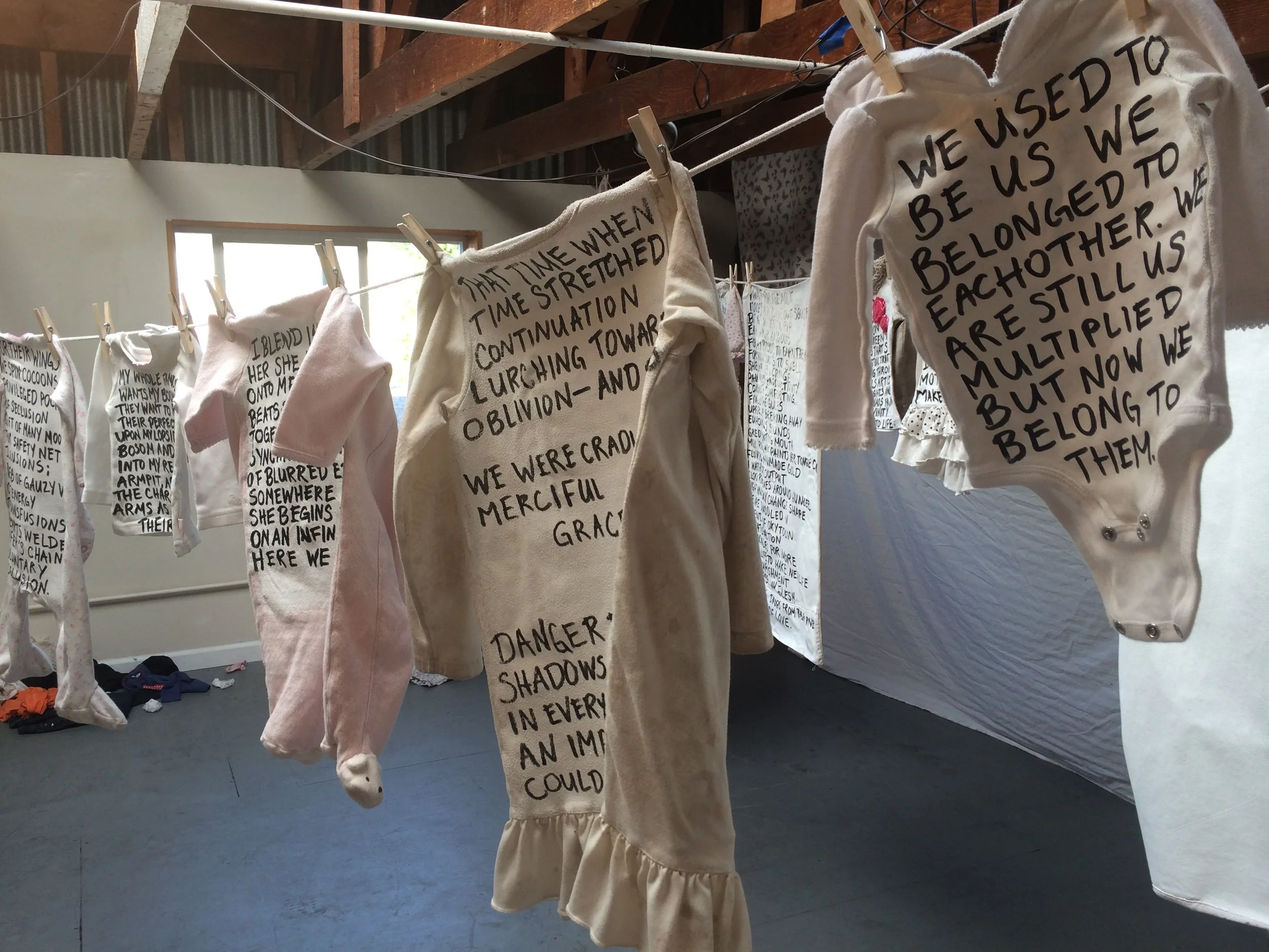 I am a writer but I have terrible handwriting. I am a mother but I am neither quick nor skilled with laundry. My whites are stained and I still love white clothing. At any give time, you will likely find piles of laundry, sorted and unsorted, in my bedroom as I divert time I could spend on household chores to writing and reading and mothering. It made perfect sense to hand write verse about motherhood onto clothing and linens worn and ruined by my daughters and I. My undone laundry is the canvas for my work.