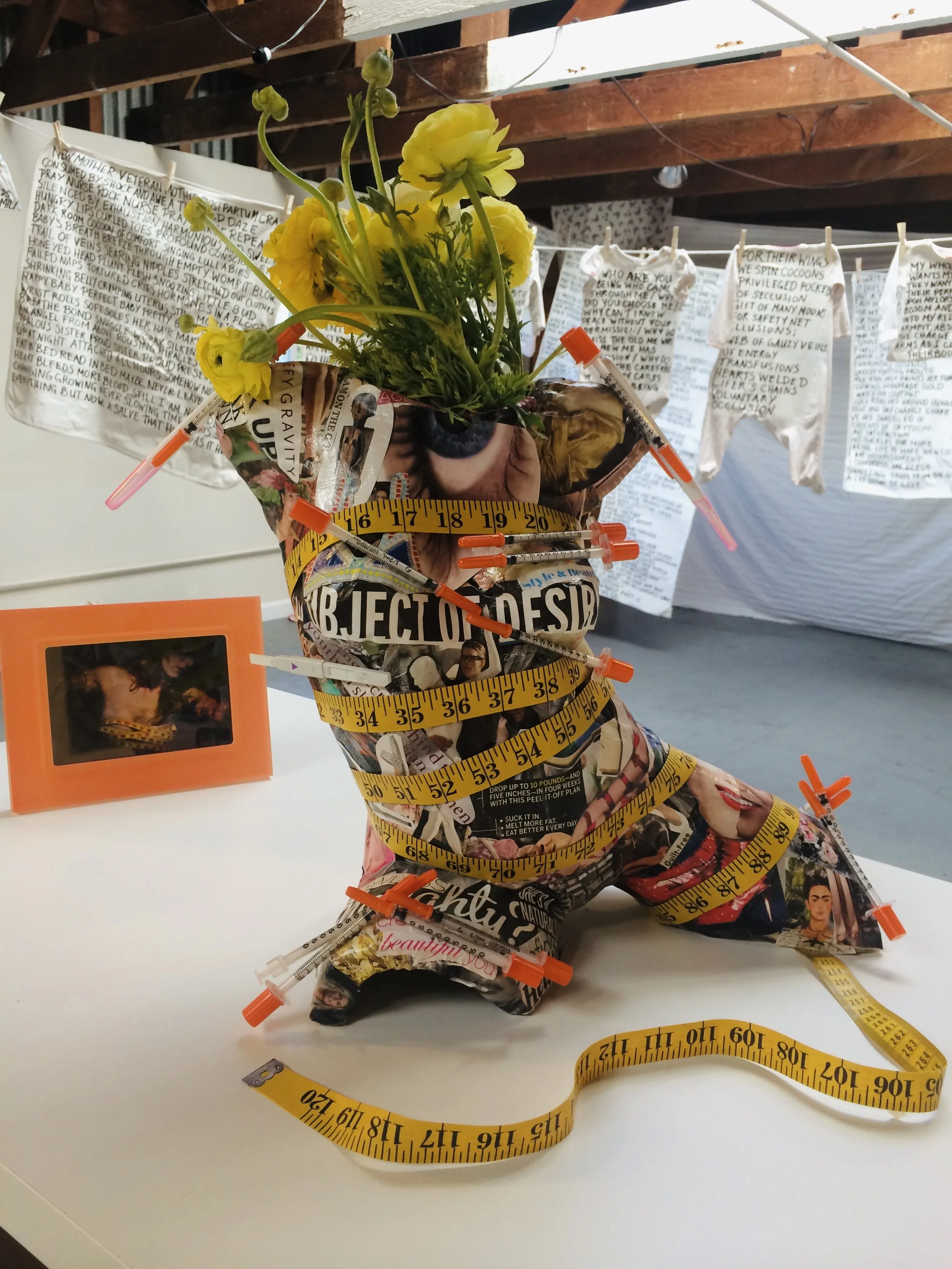 We affixed Womannequin with our own personal objects to represent advances in modern medicine that are empowering like the ovulation test and pregnancy test, invasive like the insulin syringe, and careful like the weigh-ins. Science has opened miraculous windows into the womb using lab tests and sonograms, but the results are often interpreted using subjective numbers as the only benchmarks, resulting in misdiagnoses that fail to take into account the whole person. This fear-based culture turns a natural physiological process into illness and birth into a medical emergency, numbing our glory along with our pain.